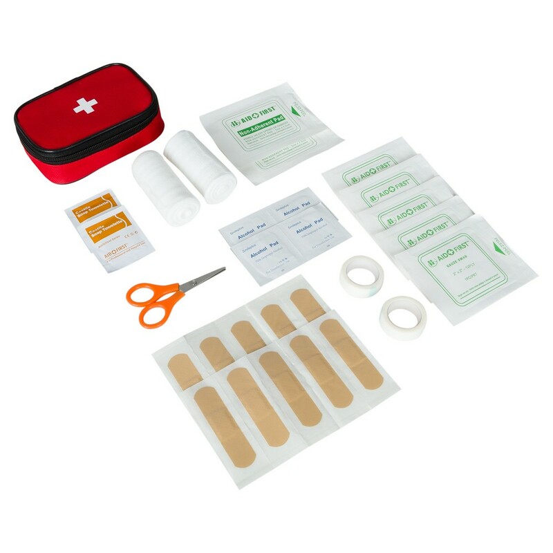 Apteczka w pokrowcu z główną przegrodą na zamek błyskawiczny, z tyłu posiada mocowanie na rzep umożliwiające przyczepienie np. do paska, zawiera 8 elementów stanowiących wyposażenie apteczki: 10 plastrów, 4 płatki nasączone alkoholem, 2 taśmy, 2 nieprzylegające opatrunki, 2 bandaże, 2 waciki, 2 chusteczki nasączone mydłem oraz nożyczki, produkt wykonany z poliestru 600D