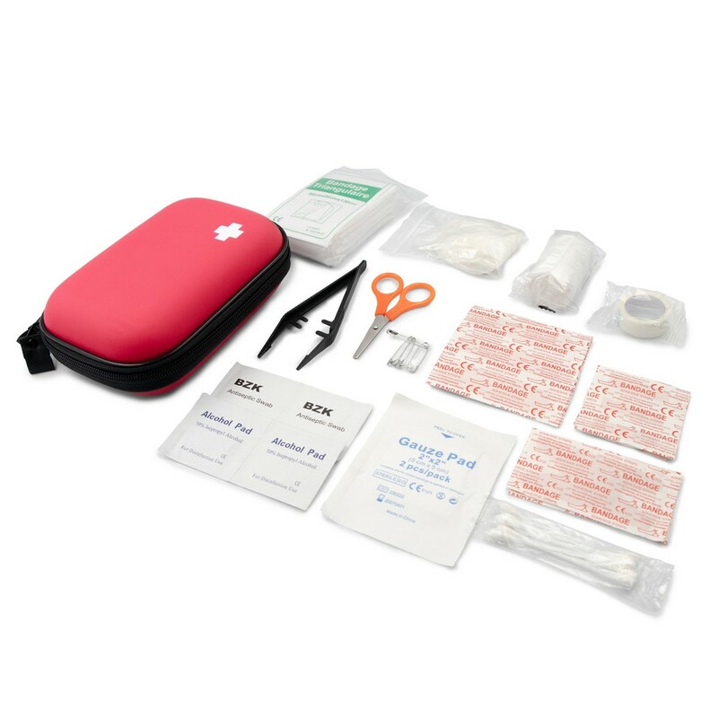 Apteczka w pokrowcu, 45 el., przegroda na zamek błyskawiczny. Wewnątrz: bandaż elastyczny 5 cm x 4,5 cm (1 szt.), rękawice winylowe (1 para), płatki nasączone alkoholem (6 szt.), antyseptyczne chusteczki (4 szt.), chusta trójkątna 96 x 96 x 135 cm (1 szt.), sterylne gaziki 2′ x 2′ (2 szt.), plastry samoprzylepne 72 x 19 mm (8 szt.), plastry samoprzylepne 40 x 10 mm (8 szt.), plastry samoprzylepne 'H’ (2 szt.), guma uciskowa (1 szt.), nożyczki 9 cm (1 szt.), pinceta plastikowa (1 szt.), taśma klejąca 1,25 cm x 5 m (1 szt.), agrafki (4 szt.), waciki bawełniane (5 szt.).