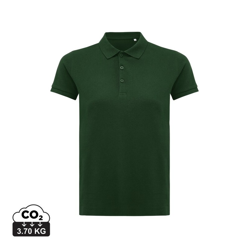 Koszulka polo, damska, zapięcie na 3 guziki, krój medium, splot Pique, krótkie rękawy, wykonana w 50% z bawełny z recyklingu i w 50% z bawełny organicznej o gramaturze 220 g/m2, bez dodatku poliestru, posiada wbudowany znacznik AWARE™, który potwierdza wykorzystanie materiałów z recyklingu, posiada kod QR na metce, który prowadzi do cyfrowego paszportu produktu, 2% wpływów z każdego sprzedanego produktu jest przekazywane na rzecz Water.org