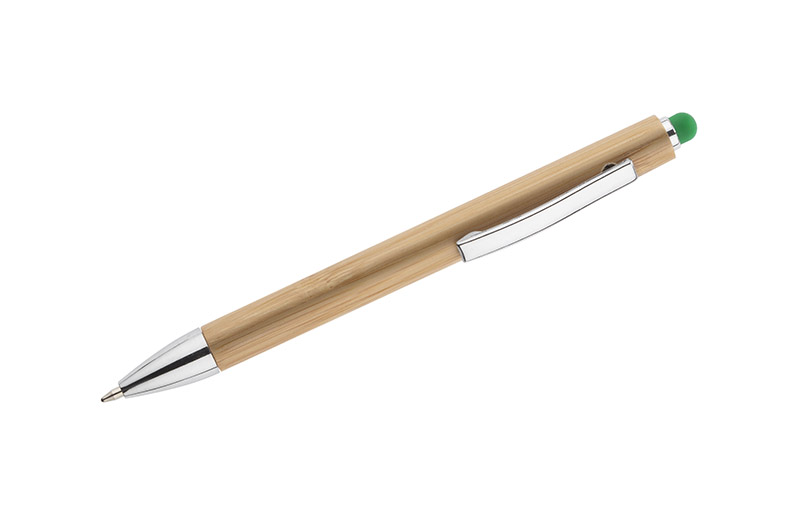 TUSO to długopis, którego korpus został w całości wykonany z bambusa. Chromowane wykończenia nadają mu elegancji. Kolorowa końcówka do obsługi ekranów dotykowych stanowi ciekawą ozdobę. Długopis automatyczny. Wkład typu G2 w kolorze niebieskim.