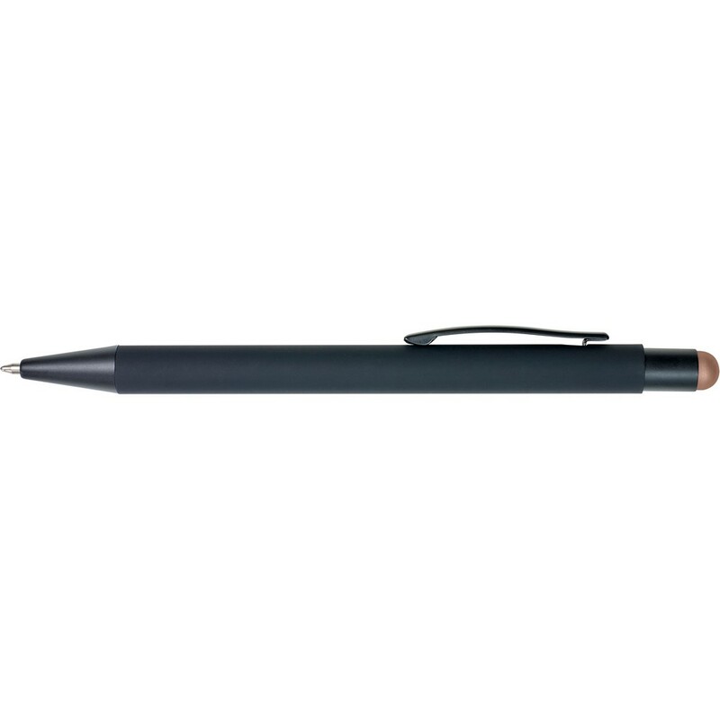 Długopis, touch pen z gumowanym wykończeniem, grawer ukazuje powierzchnię w kolorze zbliżonym do koloru gumowej końcówki lub w kolorze białym