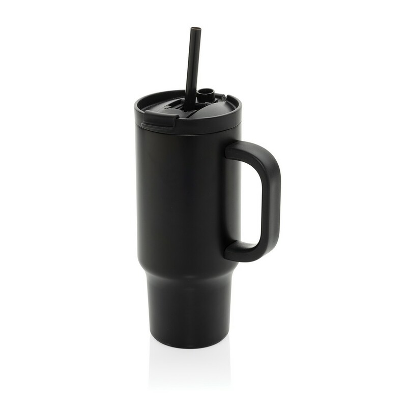 Kubek termiczny 480 ml, podwójne ścianki z próżnią pomiędzy dzięki czemu kubek posiada funkcję termosu, posiada słomkę i szeroki otwór do picia, wykonany z materiałów z recyklingu, całkowita zawartość materiałów z recyklingu obliczona na podstawie wagi całkowitej produktu: 73%