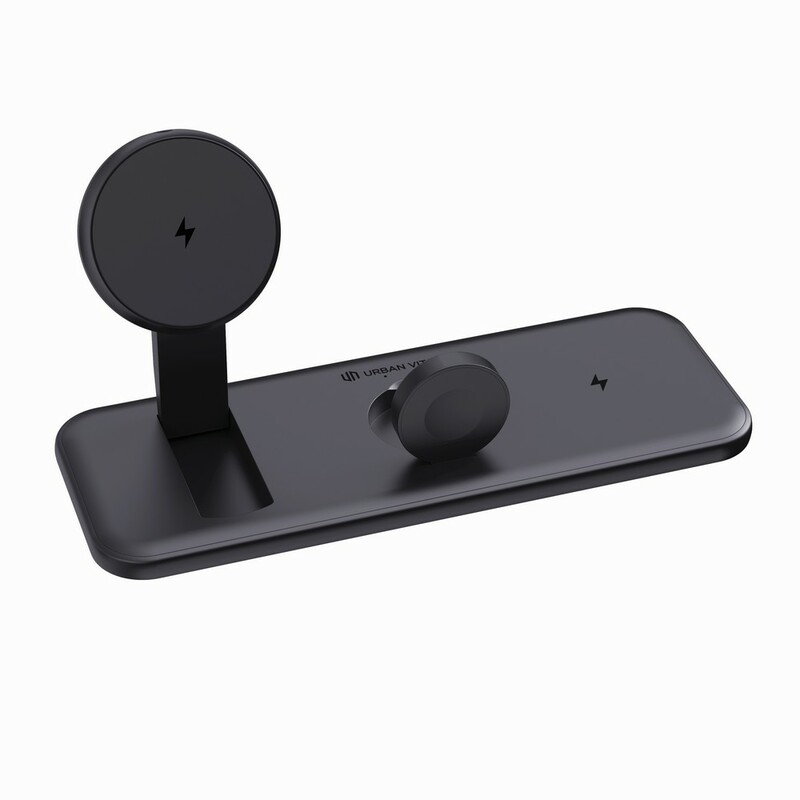 Ładowarka bezprzewodowa 3 w 1, ładowarka bezprzewodowa do telefonu 15W, ładowarka bezprzewodowa 5W do słuchawek i innej drobnej elektroniki, ładowarka bezprzewodowa do smartwatcha (działa tylko z urządzeniami iOS), składana konstrukcja, działa z telefonami posiadającymi możliwość ładowania indukcyjnego, wykonana z ABS z recyklingu z certyfikatem RCS, całkowita zawartość materiałów z recyklingu obliczona w oparciu o wagę całkowitą przedmiotu: 37%, kabel z TPE z recyklingu w komplecie