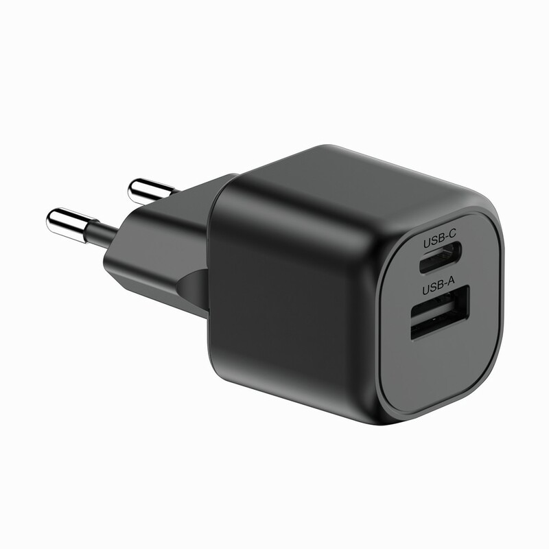 Ładowarka ścienna, moc całkowita do 20W, wyjścia USB-C i USB, wykonana z materiałów z recyklingu, całkowita zawartość materiałów z recyklingu obliczona na podstawie wagi całkowitej produktu: 38%