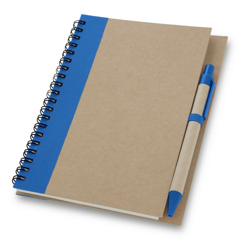 Notatnik w formacie ok. A5, posiada 60 kartek w linie (120 stron) i spiralne bindowanie, w komplecie znajduje się długopis z kolorowymi elementami, wkład w niebieskim kolorze, okładka wykonana z kartonu z kolorowym elementem przy bindowaniu