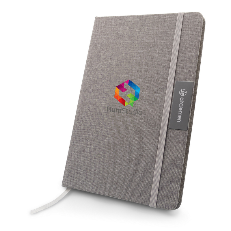 Notatnik w formacie A5, posiada 80 kartek w linie (160 stron), dodatkowe zamknięcie w postaci dopasowanej kolorystycznie elastycznej opaski, posiada metalowy element na grawerunek logotypu lub hasła, twarda okładka wykonana z RPET