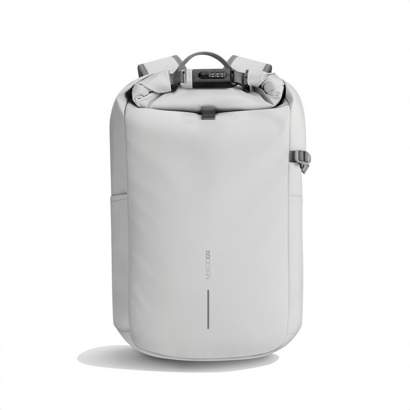 Plecak chroniący przed kieszonkowcami, zwijana przegroda główna i zamek szyfrowy wzmocniony stalą umożliwiający całkowite zamknięcie plecaka, zamek może posłużyć również do przypięcia plecaka do stałego obiektu, ukryte kieszenie do przechowywania dokumentów i kart kredytowych z tyłu torby oraz w pasku na ramię z ochroną RFID, kieszeń boczna, odpinana elastyczna siatka na sprzęt sportowy w komplecie, wewnątrz usztywnione przegrody na laptopa 16′ lub tablet, siateczkowe kieszenie na inne przedmioty osobiste, całkowita zawartość materiałów z recyklingu obliczona w oparciu o wagę całkowitą przedmiotu: 11%, wzór zastrzeżony®