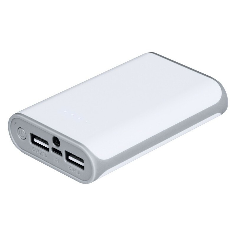 Power bank 6000 mAh, wyjścia 5V/2.1A oraz 5V/1A, wejście 5V/1A, 4 diody wskazujące poziom naładowania, lampka LED, w komplecie kabel micro USB