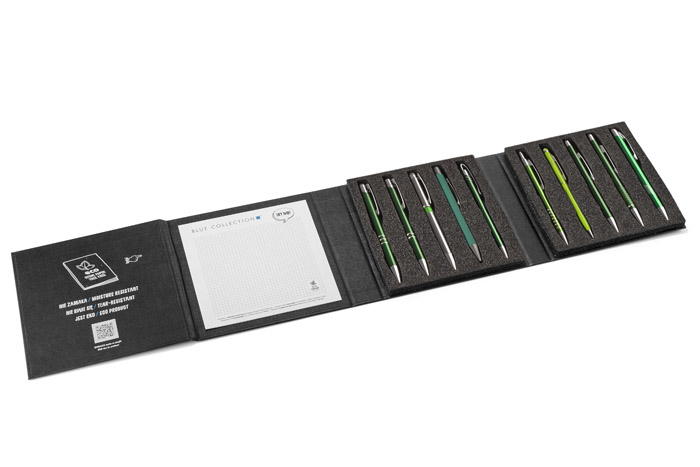 Nowoczesny i elegancki wzornik mieszczący 10 najpopularniejszych metalowych długopisów z oferty Blue Collection.