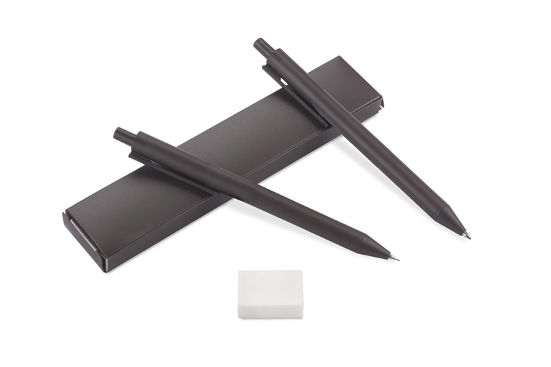 Zestaw KOPIKO składa się z długopisu, ołówka automatycznego oraz linijki wykonanych z tworzywa zawierającego w składzie ziarna kawy oraz klasycznej gumki do mazania.