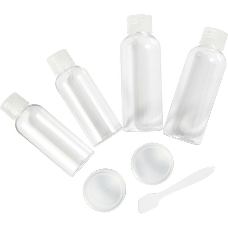 Zestaw podróżny w przezroczystym opakowaniu, 2 butelki 100 ml, 2 butelki 50 ml, 2 pojemniki 10 ml, 1 łopatka