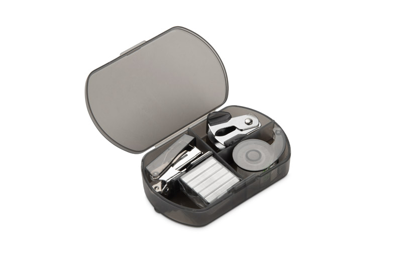 Zestaw biurowy DOCSY to kompaktowe rozwiązanie zawierające najpotrzebniejsze akcesoria: mini zszywacz, mini dziurkacz, taśmę klejącą oraz zapas zszywek – wszystko zamknięte w poręcznym etui z tworzywa. Idealny do pracy w terenie, na małym biurku lub jako praktyczny gadżet reklamowy dla branży biurowej i edukacyjnej.